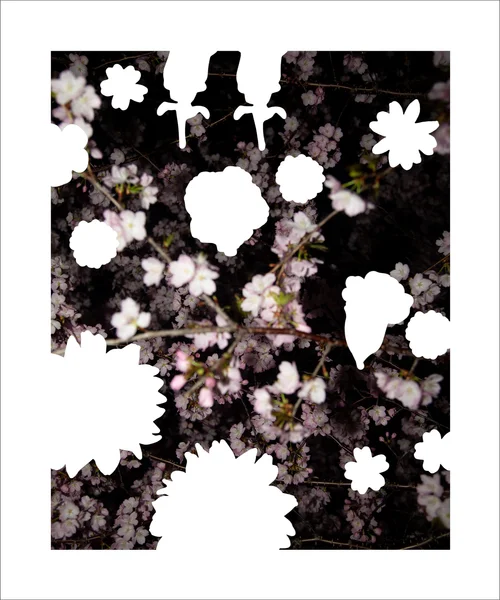 Obscured Flowers, 20 x 16 inches, black Sumi ink on inkjet print (foreground), Cosmos Wallpaper, 40 x 50 inches, inkjet print on adhesive paper (background)